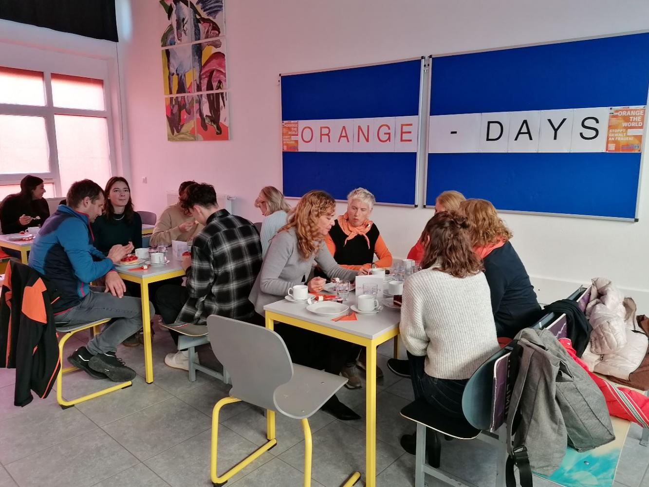 Die Dienstleistergruppe hat unser Schulhaus in der Farbe Orange gestaltet. Es wurden im ganzen Gebäude orange Sachen aufgehängt oder aufgestellt. Sogar die Fenster wurden mit orangenem Papier beklebt, so dass man gar nicht raussehen konnte. Sinn dahinter war, dass auf die internationalen „Orange Days“ aufmerksam gemacht wurde. Diese Aktionstage stellen einen Protest gegen Gewalt an Frauen und Mädchen dar. Im Zuge dieses Projektes wurden auch drei Sitzbänke neugestaltet. Diese Bänke sind jetzt im ganzen Ort von Jenbach verteilt und sind ein richtiger Hingucker. Am 25. November kam Landesrätin Eva Pawlata nach Jenbach, um sich ein Bild von den unterschiedlichen Aktionen rund um die Orange Days zu machen. Der offizielle Empfang mit Kaffee und Kuchen fand dafür in unserer Schule statt. Dieses Projekt wurde von unserer Lehrerin Karin Thaler in Kooperation mit Angela Rainer von der sone freiwilligenbörse organisiert.