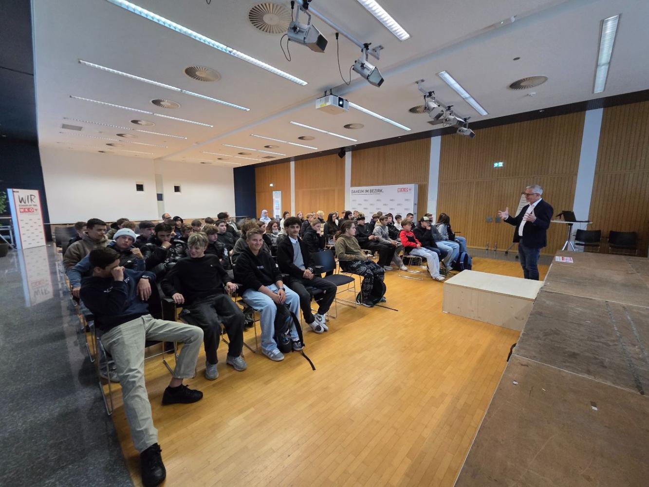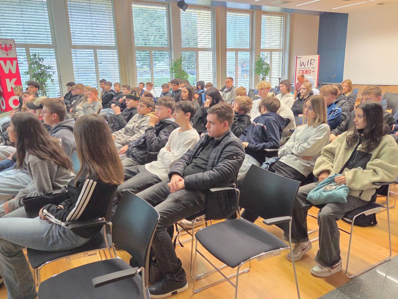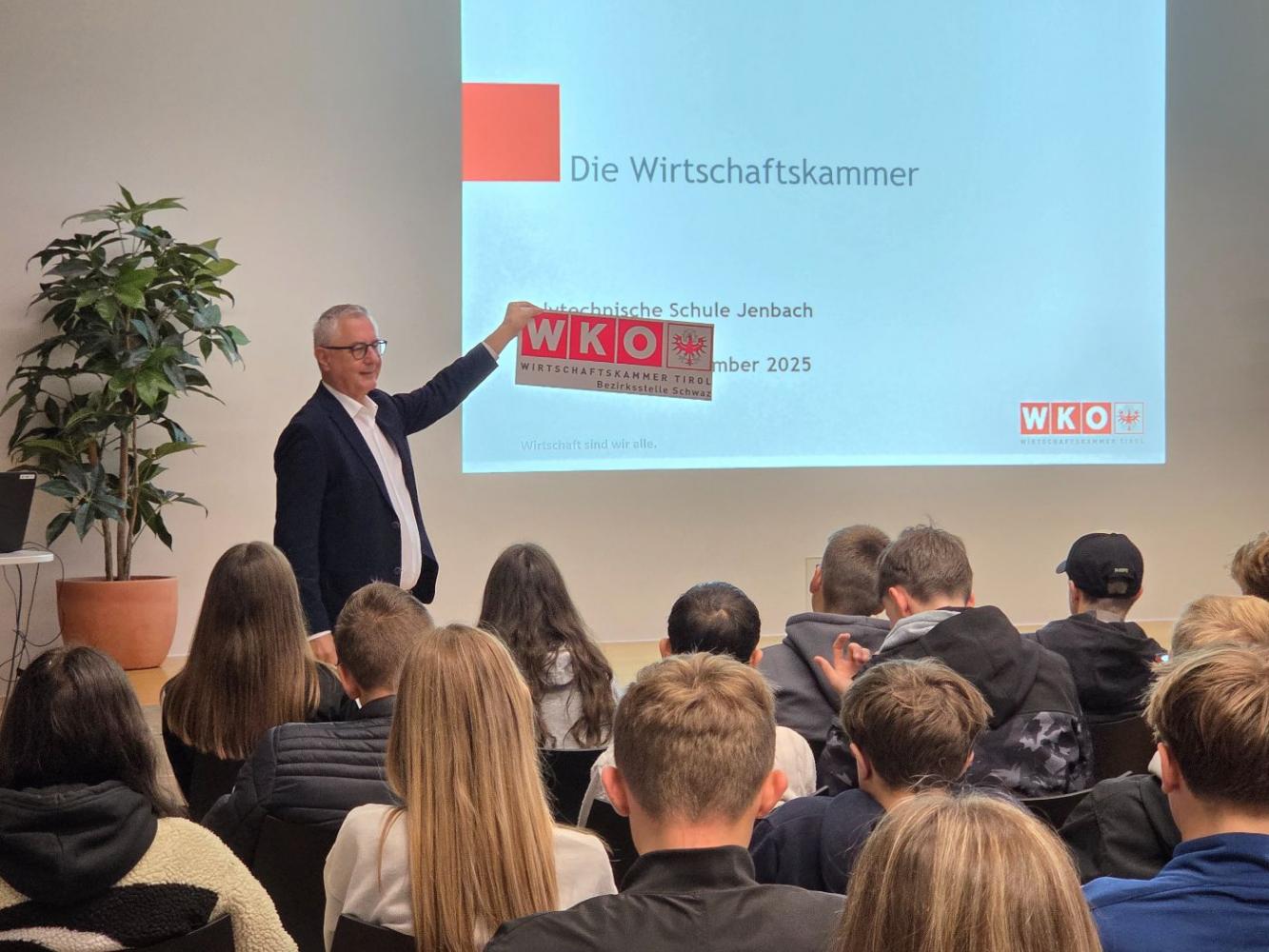 In der ersten Station, der Wirtschaftskammer Bezirksstelle Schwaz begrüßte uns Bezirksstellenleiter Stefan Bletzacher persönlich im großen Saal. Er vermittelte den Jugendlichen die Bedeutung der Wirtschaftskammer als Teil der Sozialpartner, aber auch, was die Wirtschaftskammer mit dem Thema Lehre zu tun hat. Mit eindrucksvollen Zahlen berichtete er über den aktuellen Lehrlingsstand und die großen Chancen für die Zukunft, wenn man einen Lehrberuf wählt.