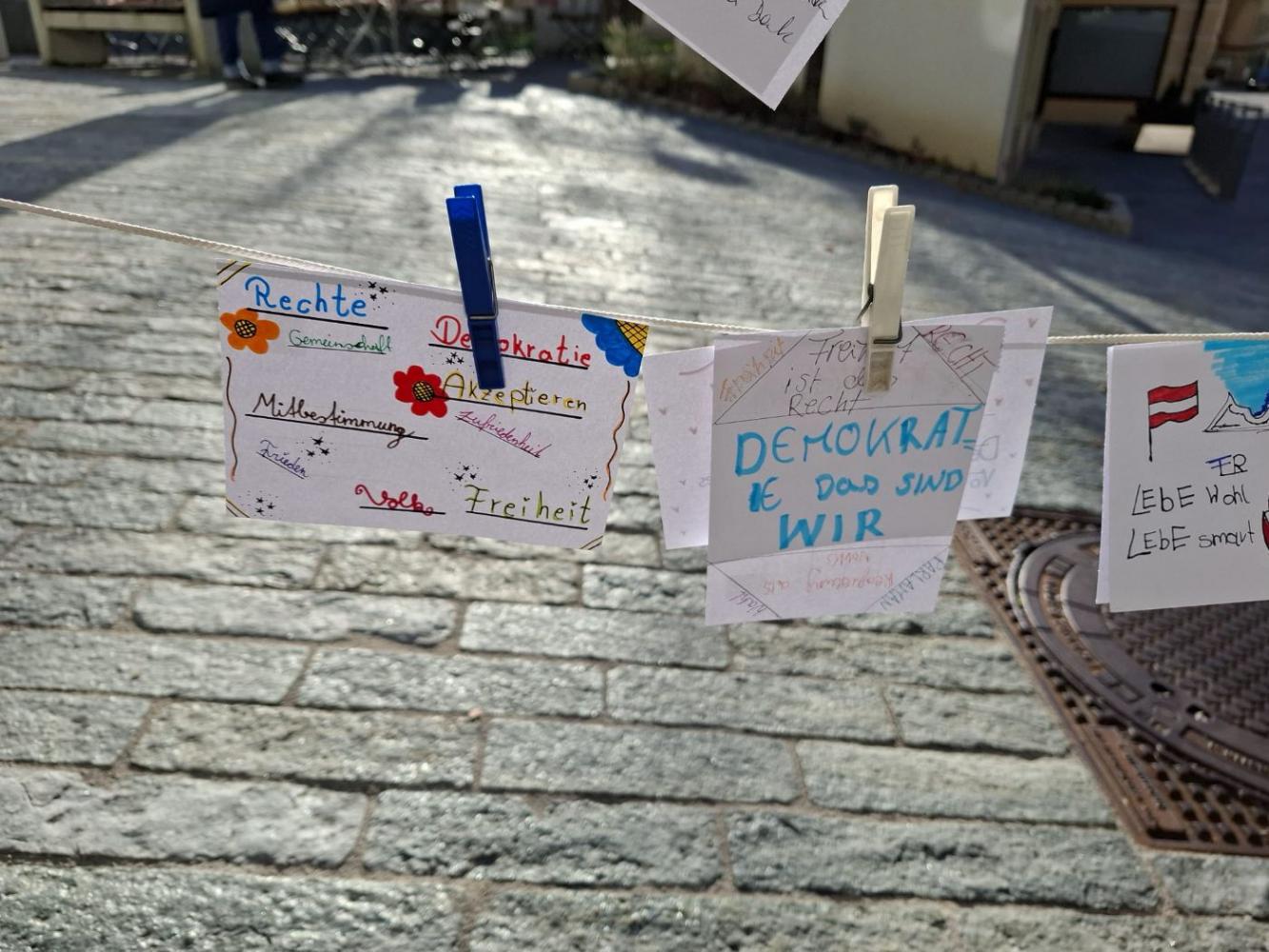 Die Postkarten der Schülerinnen und Schüler der Volksschule und der Polytechnischen Schule wurden schließlich bei einem sehr gut besuchten Infostand am 25. Oktober im Dorfzentrum vor der Bücherei aufgelegt. Dieser Stand wurde von Roswitha Gebauer und Inka Hilscher vom Verein Toleranz sowie von Edith Rose vom Verein Ja Demokratie vorbereitet und betreut. Vorbeigehende Interessierte konnten sich so nicht nur mit aufliegenden Materialien informieren, sondern auch ihre eigenen Gedanken und Wünsche an die Demokratie auf den Postkarten festhalten. Die Karten wurden auf eine „Rettungsleine“ gehängt, die zum Ausdruck bringt, dass Demokratie als wichtiges Gut kein Selbstläufer ist, sondern dass ständig daran gearbeitet werden muss.