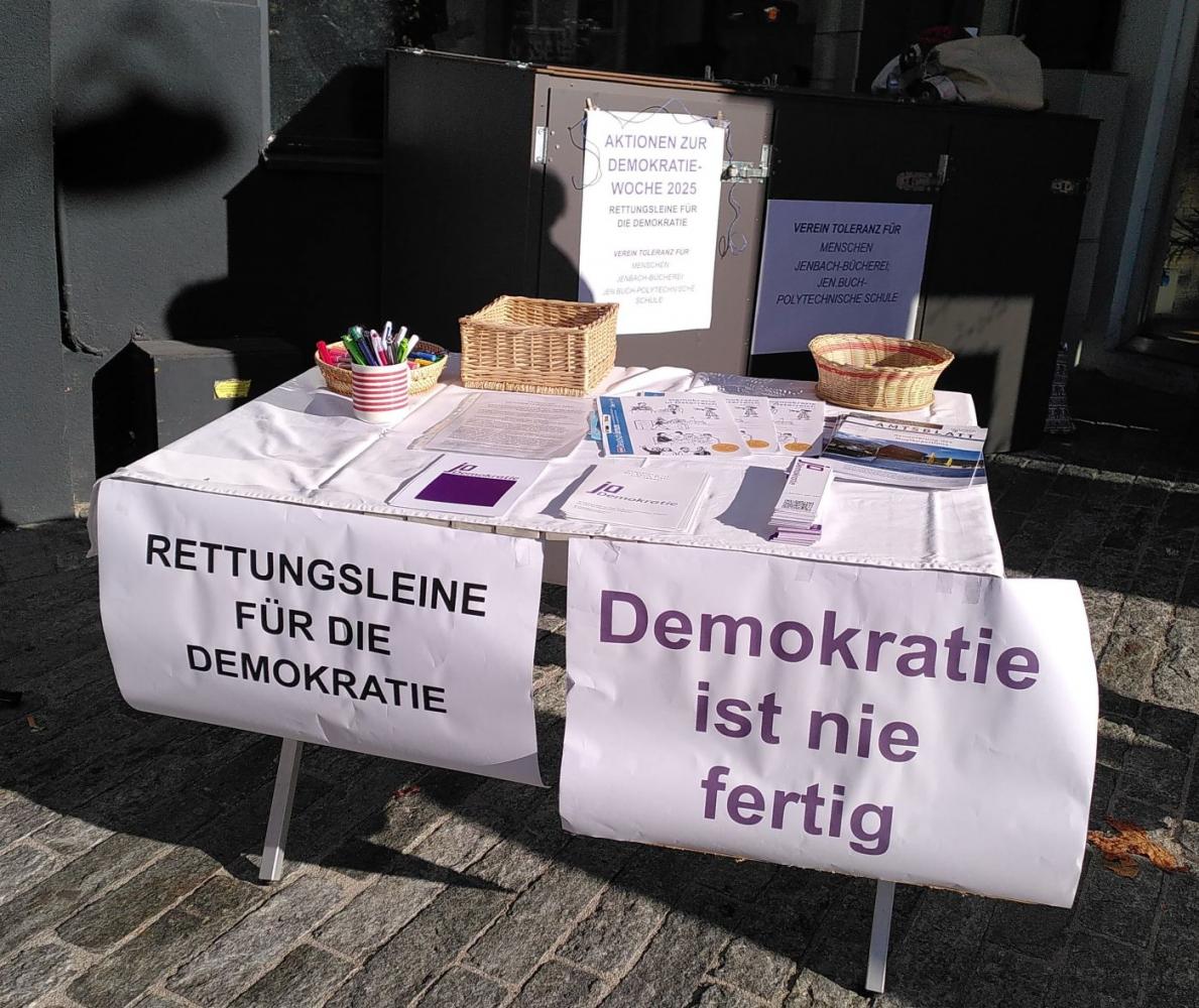 Von 20. bis 24. Oktober fand die österreichweite Demokratiewoche von „Bündnis 2025“ und der Initiative „Ja – Demokratie“ statt. Das nutzten Einrichtungen in der Marktgemeinde Jenbach, um über dieses wichtige Thema zu informieren. Gemeinsam veranstaltete der Verein Toleranz, die Markt- und Schulbücherei jen.buch sowie die Polytechnische Schule Jenbach eine Reihe an Veranstaltungen für Schülerinnen und Schüler sowie für die Bevölkerung.